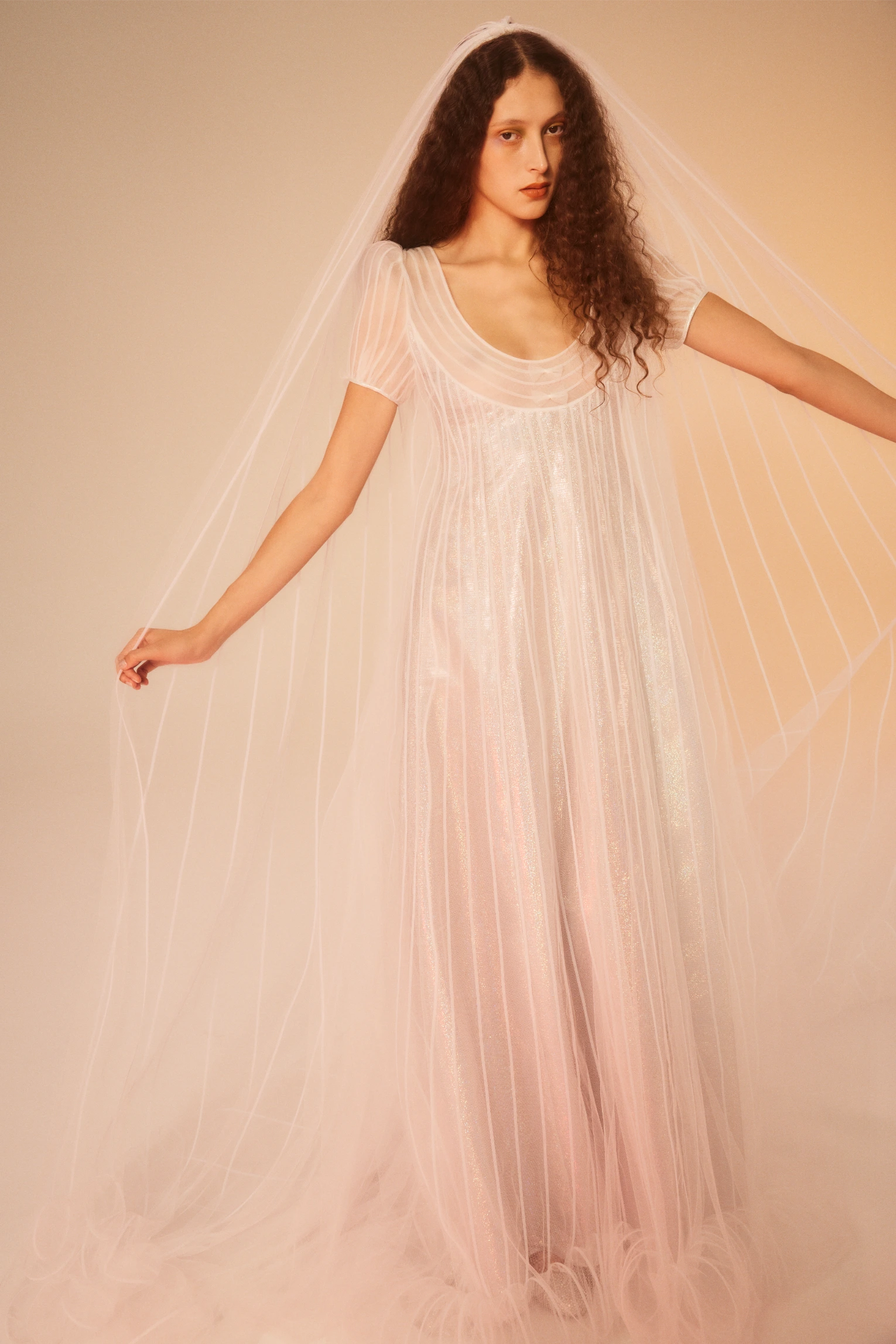 tulle overlay gown with metallic lining and looped horsehair hem