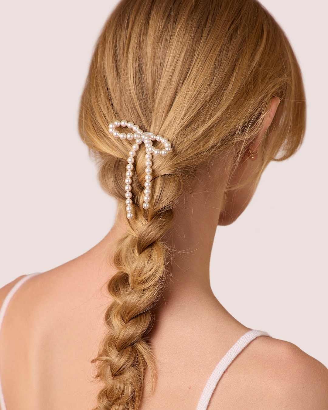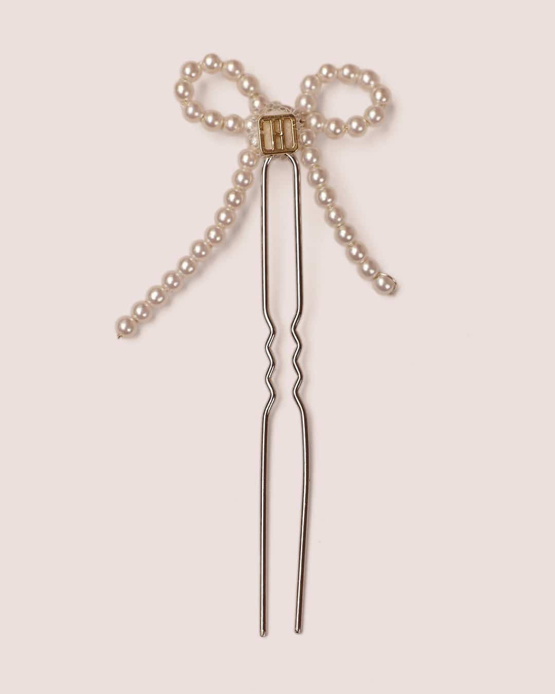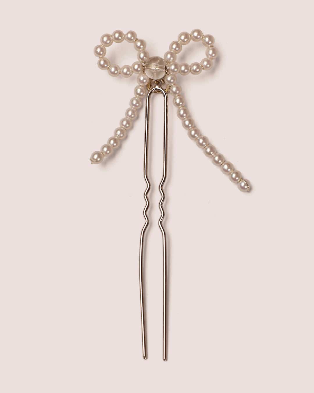 Ivory pearl bow with central iridescent bead, set on large silver bun pin.