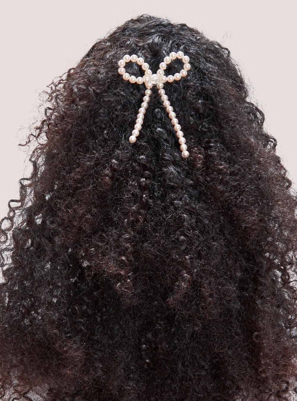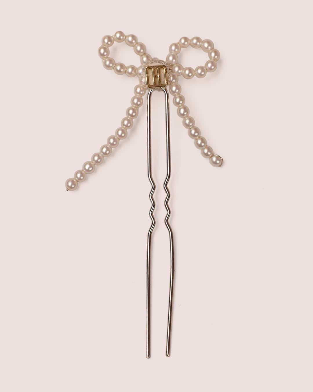 White pearl bow hair pin with central iridescent bead, set on signature silver-toned pin.